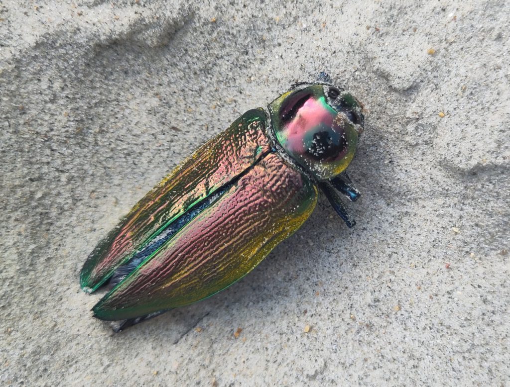 At 5 to 8 cm long, it’s one of the largest members of the Buprestidae family, known for their glossy, iridescent colors that shimmer in the light.