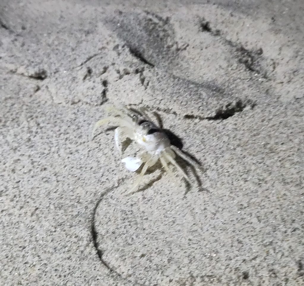 Adults make their homes in sandy burrows dug just above the strandline—sometimes reaching as deep as 1.3 meters. These burrows can even be sealed shut with sand during the hottest hours of the day, offering a cool refuge. With swiveling compound eyes that grant nearly 360° vision, ghost crabs are always on alert.